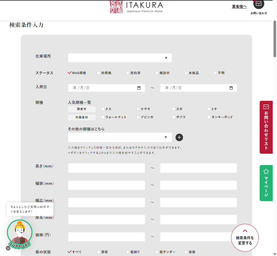 サポートAIは、探し方に迷ったときや、板選びの考え方を知りたいときの補助として使っていただき、具体的な樹種の一覧や在庫確認は、検索フォームとあわせて活用してもらえたらと思います。