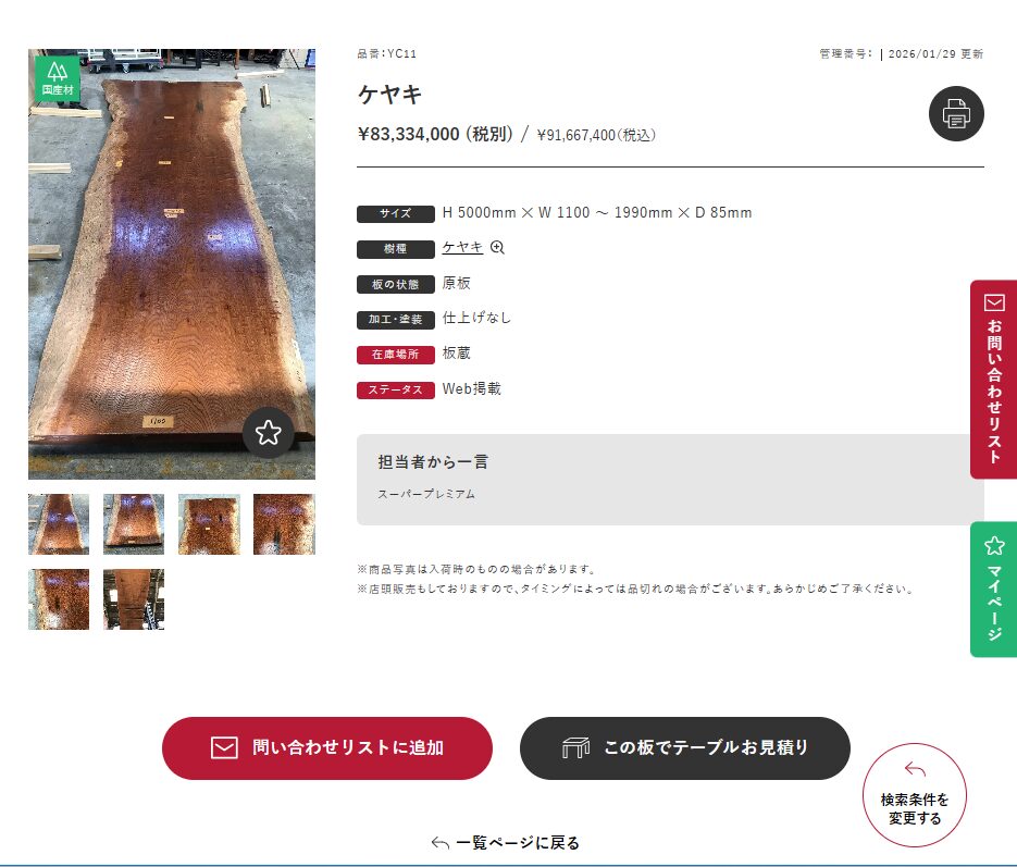 一枚板検索システムでは、取り扱っている板すべてが掲載されています。