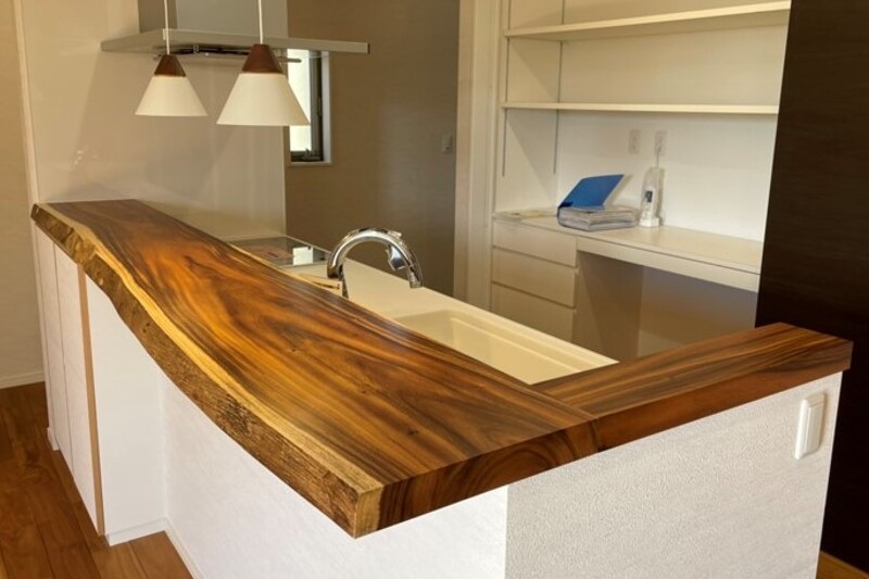 不規則な木目を持つモンキーポッドは、板によって木目の入り方や木目の濃さが異なるので、同じ樹種であっても板によって印象が違うことがあります。また、白太(耳)の入り具合によっても印象が異なり、まさにオンリーワンの板を選ぶことができます。